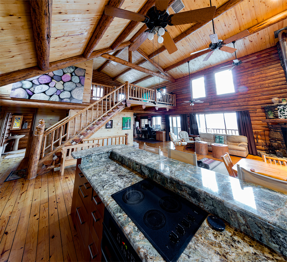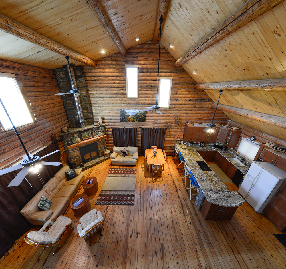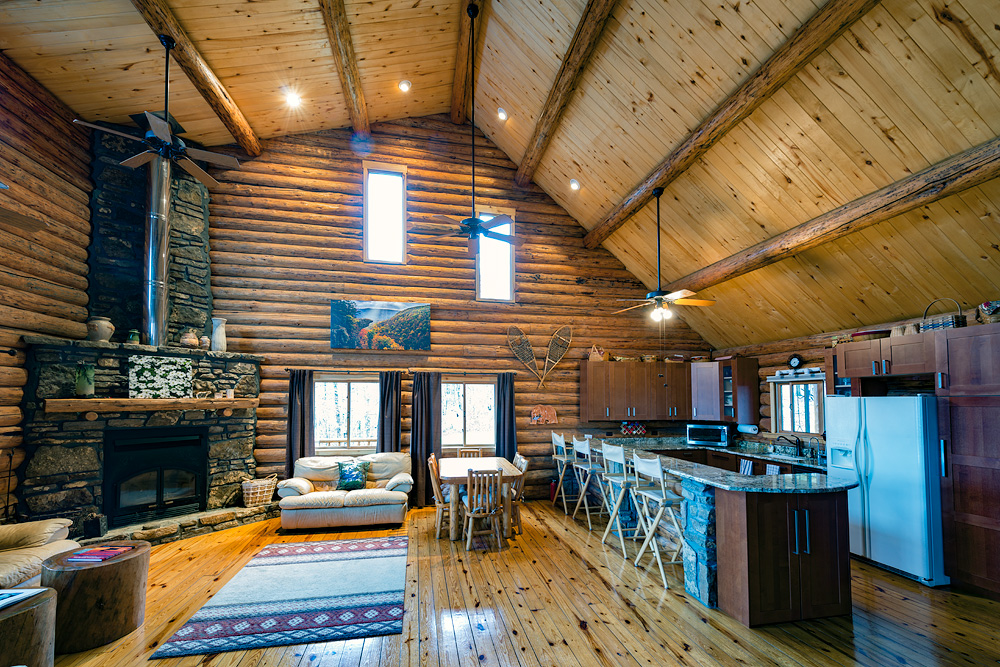 cabinets, open log beam and T&G aspen ceiling, 2 large