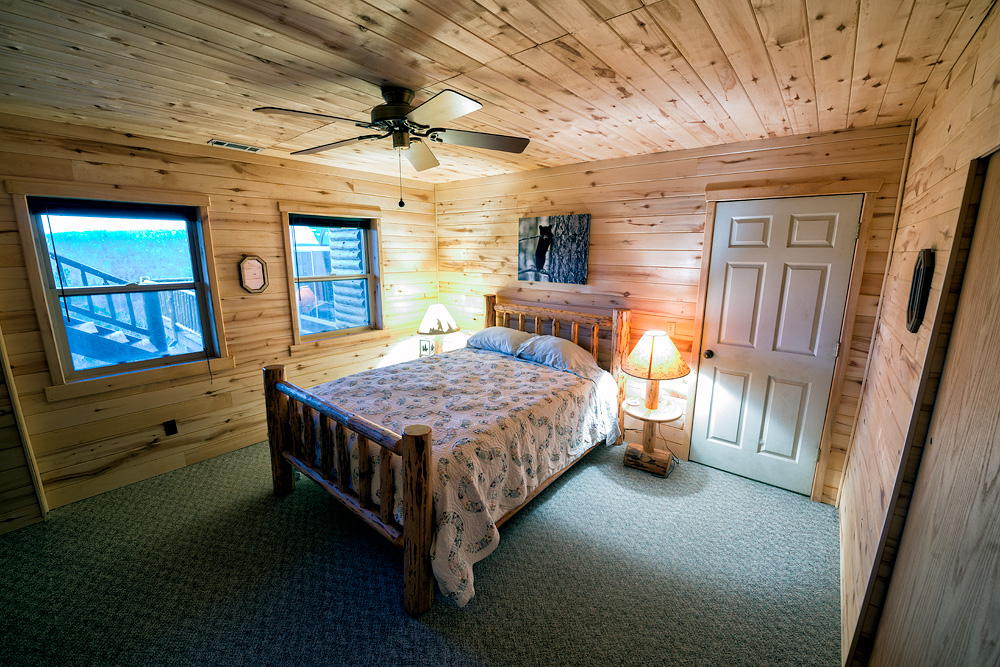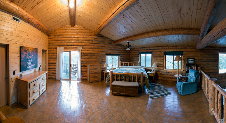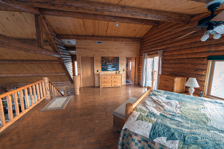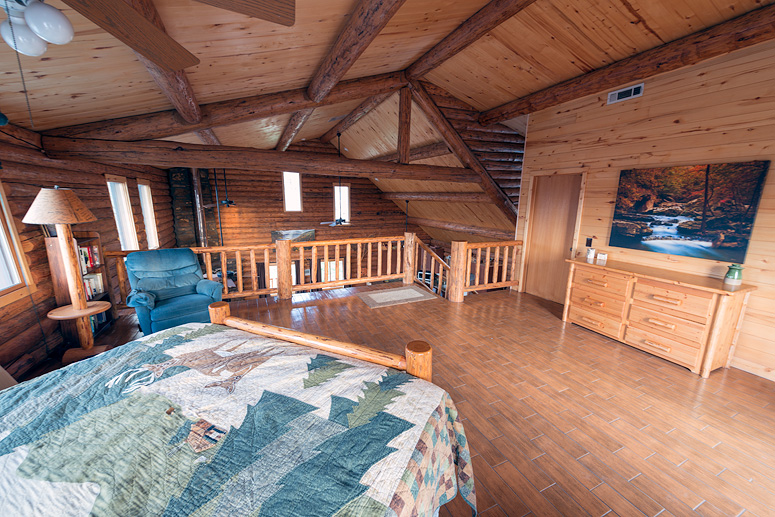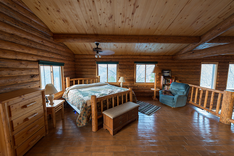 - guest bedroom 12' x 13', open beams, one log wall, three