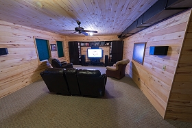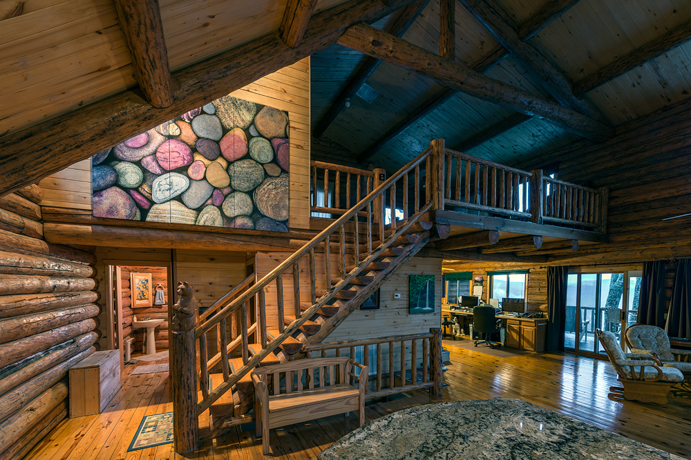 23' ceiling, T&G aspen ceiling, wood burning native stone